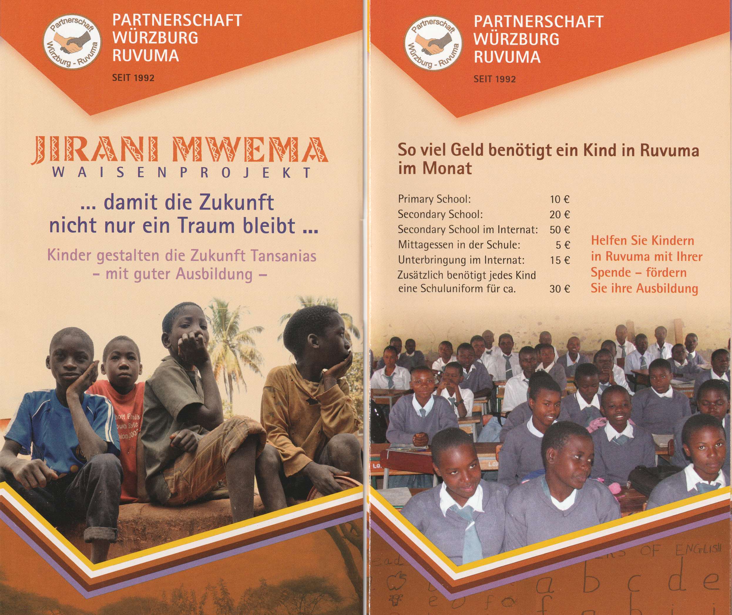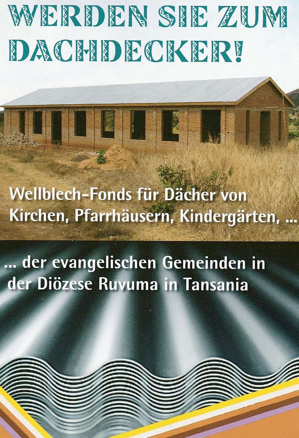 Für dieses Projekt haben wir ein Faltblatt, von dem Sie hier 2 Seiten sehen. Auch für den Wellblechfonds sammeln wir weiterhin Spenden. Aus dem Fonds bezuschusst die Diözese Ruvuma Dächer für kirchliche Gebäude.