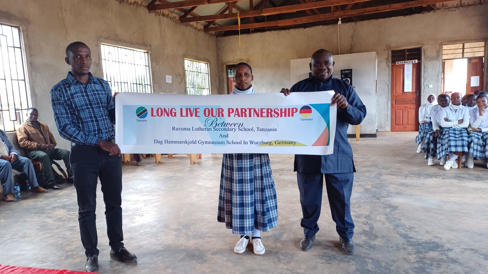 Die Reisedelegation besuchte im Jahr 2022 die Luther-Schule in Songea/Mshangano. Es wurde Kontakt zum Schulleiter Evans Mwasifiga geknüpft. Seither her entwickelt sich eine Schulpartnerschaft mit mit dem Evang. Dag. Ham. Gymnasium in Würzburg. Pfr. Christian Herpich, der stellv. Schulleiter des evangelischen Dag – Hammarskjöld-Gymnasiums (DHG) bgerüßte im Februar 2024 die Mitglieder des Dekanatspartnerschaftskreises Katharina Sannemann, Reinhild Wesselowsky, Rainer Schacht und Kirsten Bähr. Sie begeisterten die Schülerinnen und Schüler an den Projekttagen der Schule. Zum Motto „Kinder der EINEN Welt“ gestalteten sie Themen zur Schulpartnerschaft: die Sechstklässler/innen lauschten der Begrüßung in Kisuaheli und beteiligten sich sehr interessiert am Gespräch mit Erzählungen und Bildern vom Leben der tansanischen Kinder und Jugendlichen. Tansanische Lieder wurden gesungen und beim Spielen afrikanischer Spiele beeindruckten die von tansanischen Kindern selbst hergestellten Fußbälle aus Kunststoff- und Textilresten die Würzburger Kinder sehr. Absoluter Höhepunkt war die Videokonferenz mit Schulleiter Evans Mwasifiga und seiner tansanischen Schulklasse. Es ist eine Partnerschaft mit Zukunft! Im August 2024 wurde ein Banner übergeben, das nun auch im Evang. Gymnasium präsentiert wird. PS: Von einer Spende vom Projekttag des DHG 2023 wurde von Luther-Schule ein Kopierer gekauft.