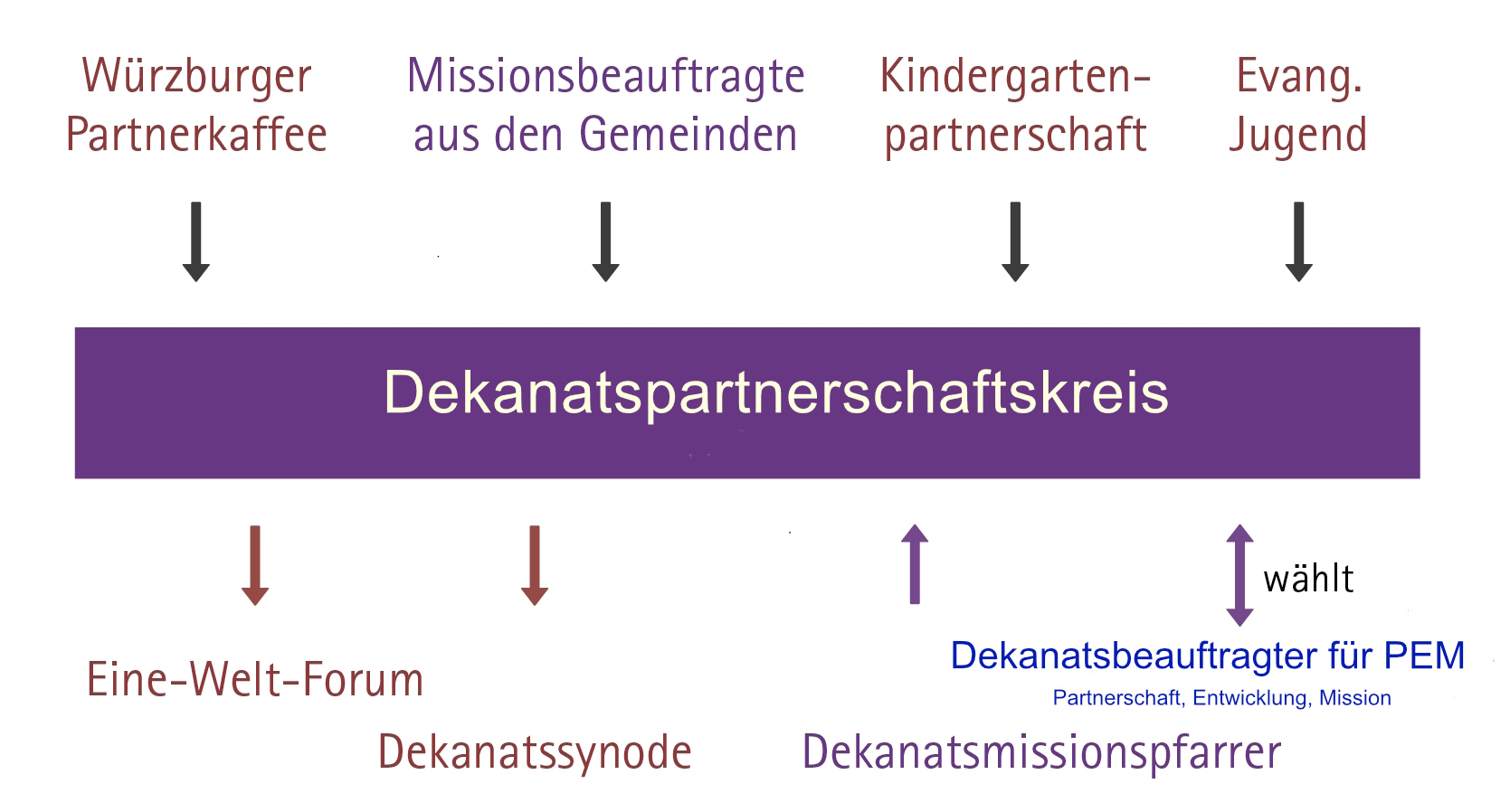 Aus jeder Gemeinde des Dekanats wird ein/e Gemeindemissionsbeauftragte/r in den Dekanatspartnerschaftskreis entsandt. Dazu gehören auch die Vertretung des Dekanats beim Verein Würzburger Partnerkaffee, die Evang. Jugend und Vertreter von evt. Schulpartnerschaften. Es gibt offizielle Funktionen – z. B. den Dekanatsbeauftragten für Partnerschaft, Entwicklung und Mission, gewählte Repräsentant/innen in Verbänden, Kreisen und in der Dekanatssynode. Der Dekanatsmissionspfarrer leitet den Kreis. Im Jahr 2022 änderte der Dekanatsmissionskreis seinen Namen in Dekanatspartnerschaftskreis.